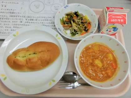 今日は、ガーリックフランス、牛乳、きのこと小松菜のソテー、ビーンズシチューです。