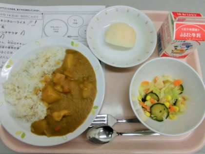 今日は、チキンカレーライス、牛乳、フレンチサラダ、梨(豊水)です。