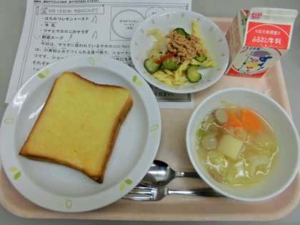 今日は、はちみつレモントースト、牛乳、ツナとマカロニのサラダ、野菜スープです。