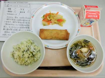 今日は、菜飯、牛乳、春巻き、辣白菜(ラーパーツァイ)、わかめスープです。