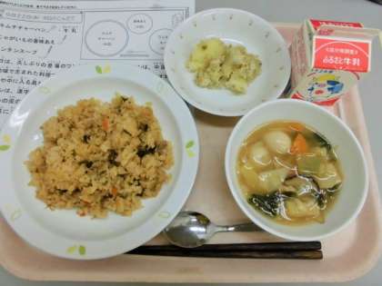 今日は、キムチチャーハン、牛乳、じゃがいもの香味あえ、ワンタンスープです。