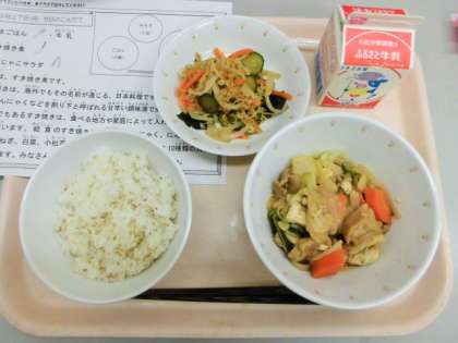 今日は、ごまごはん、牛乳、すき焼き煮、カリじゃこサラダです。