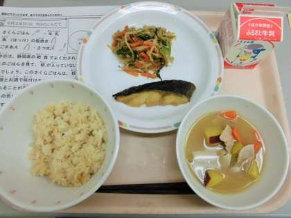 今日は、さくらごはん、牛乳、魚(ほっけ)の塩焼き、ごまあえ、さつま汁です。