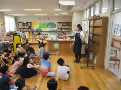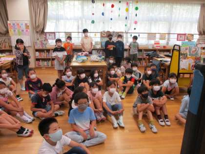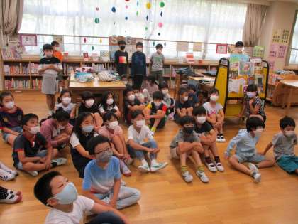 3年生の図書の時間の様子です。司書の先生の話をよく聞いています。読書の秋、多くの良書に出会って欲しいと思います。