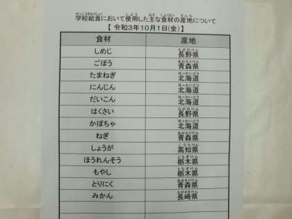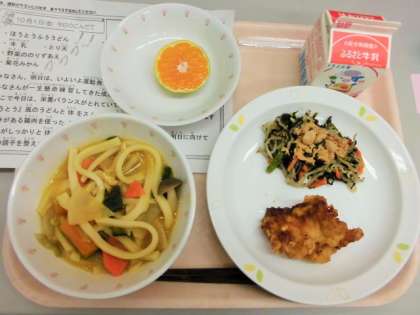 今日は、ほうとう風うどん、牛乳、とり天、野菜ののり酢あえ、菊花みかんです。
