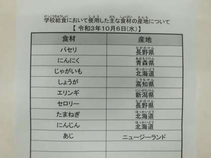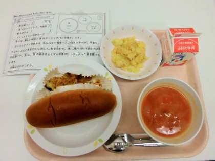 今日は、黒砂糖パン、牛乳、魚(鯵)のガーリックパン粉焼き、粉ふきいも、トマトとエリンギのスープです。