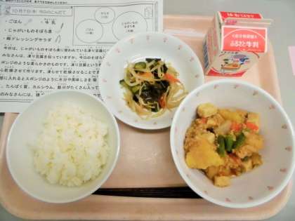 今日は、ごはん、牛乳、じゃがいものそぼろ煮、梅ドレッシングサラダです。