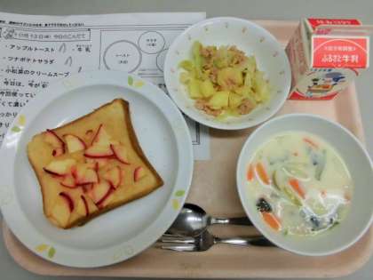 今日は、アップルトースト、牛乳、ツナポテトサラダ、小松菜のクリームスープです。