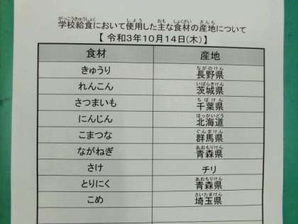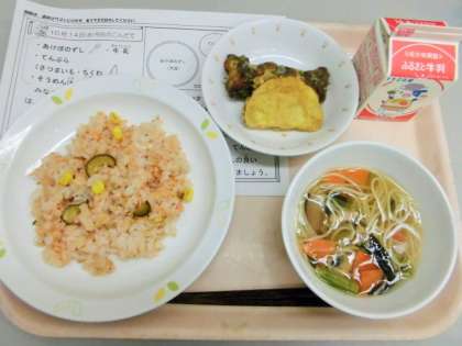 塚戸小学校開校記念日のお祝いし、塚戸小学校がこれからもこの地にしっかりと根をはり、先の見通しが明るく長く続いていくことを願って、さつまいも、ちくわ、鮭、そうめんを使った献立を取り入れました。