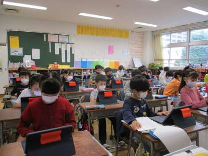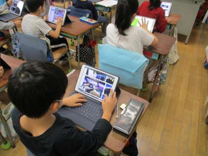 3年生の総合的な学習の時間で「ドリームマップ」という学習をしています。キャリア教育の一環で、自分の好きな物、食べ物、スポーツ、自分の興味ある仕事などについて調べています。今日はオリジナル新聞をつくるためにタブレット端末を使って写真を選びました。数ある写真から新聞にふさわしい写真を選ぶことも学習です。子どもたちは頑張りました。相手に伝わる新聞をつくってくださいね!