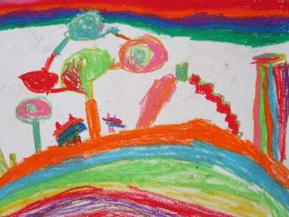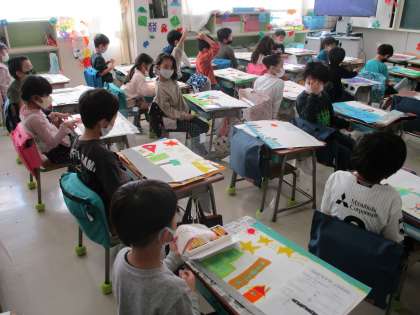 1年生の図工では「できたらいいな こんなこと」に挑戦しています。行ってみたい場所やしてみたいことを自分で考えて、作品作りをしています。個性あふれる作品になりました。
