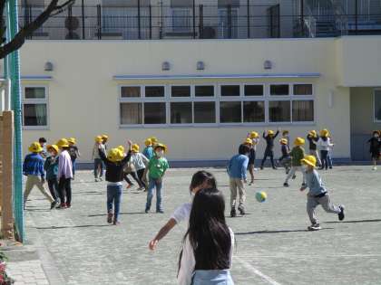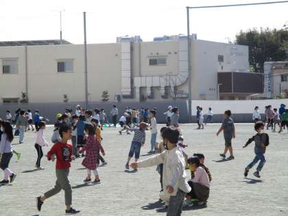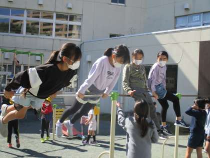 中休みの校庭の様子です。鬼ごっこ、ボールを使った遊び、ジャングルジム、鉄棒、一輪車など、元気よく遊んでいました。