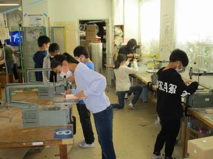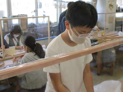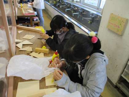 6年生の図工「夢のマイホーム」、子どもたちは夢中になって取り組んでいます。のこぎりや電動糸のこ盤を使って切ったり、木工用ボンドで組み合わせたりしています。今日のめあては「木の切り方や組み合わせ方を工夫して夢のマイホームをつくろう」です。一人一人安全に気を付けて活動することができました。