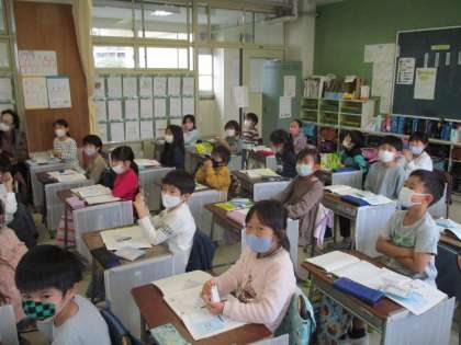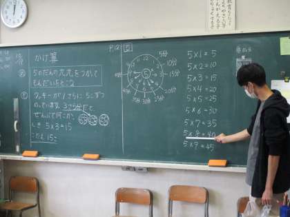 2年生の算数「九九」の学習の様子です。5の段を練習しました。「ごいちが ご」「ごに じゅう」「ごさん じゅうご」・・・。何度も何度も練習しました。学校でも、家でも練習をすれば必ず覚えます。頑張れ2年生!