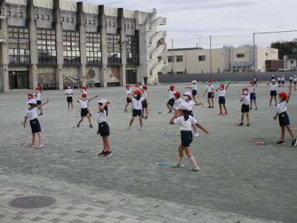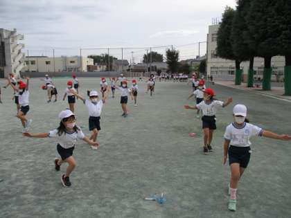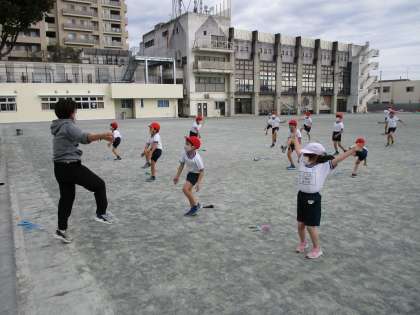 体育の準備運動の様子です。先生の動きを素早くまねしています。いろいろな動きを取り入れて楽しく活動できました。
