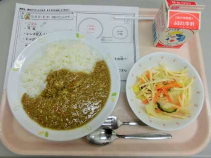 今日は、ごはん、牛乳、キーマカレー、じゃがいものパリパリサラダです。