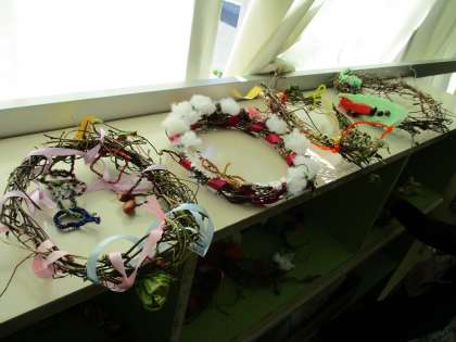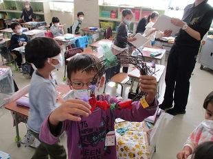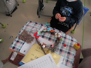 1年生が朝顔のつるを使ってリースを作りました。そして、先日の生活科見学で拾ってきたどんぐりを飾り付けました。自分たちで育てた朝顔、自分たちで拾ってきたどんぐりを材料にし「自然の恵み」を感じました。