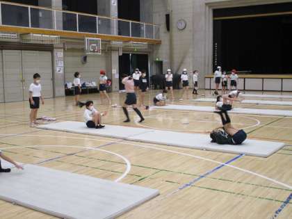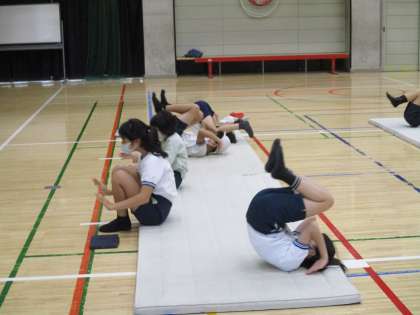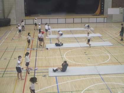 5年生の体育は「マット運動」に取り組んでいます。前転や後転、開脚前転、開脚後転、ロンダードなどの技に取り組みました。一人一人めあてをもって学習しました。