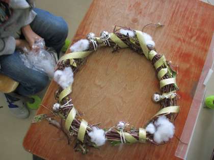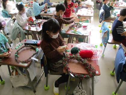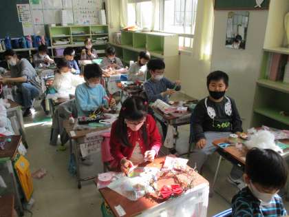 1年生のリース作りを何度か紹介しています。朝顔のつるに、どんぐりの飾り、家から持ってきた飾りを思い思いに付けていました。とても楽しく学習ができました。