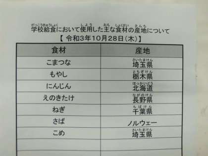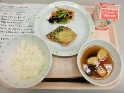 今日は、ごはん、牛乳、さばのインディアン揚げ、野菜のからしじょうゆかけ、おふとわかめのすまし汁です。