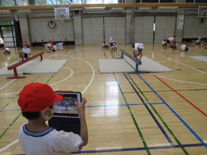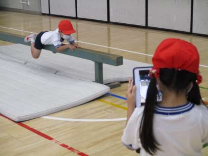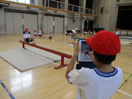 1年生の体育で、平均台をいろいろな姿勢で渡る学習をしました。学習では、平均台を渡る人、タブレット端末で動きを撮影する人と役割を決めて取り組みました。1年生でも学び合うことができることを改めて分かりました。「自分の動き」は見ることができません。友達に撮影してもらい客観的に動きを知ることができます。