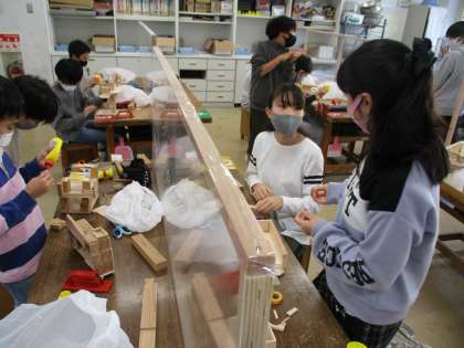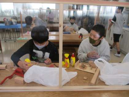 6年生の図工「夢のマイホーム」では、家が出来上がってきました。子どもたちは、木の切り方や組み合わせ方を工夫して取り組んでいます。一人一人の作品を見ていくと、随所に工夫をしていることがわかります。完成ももうすぐでしょうか?6年生頑張れ!