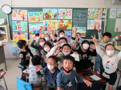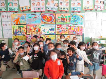1年生のあるクラスでは、図工の授業で取り組んで完成した作品を黒板に掲示していました。子どもたち一人一人、自分自身で作った作品に対して誇らし気の様子が見られました。