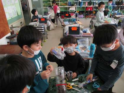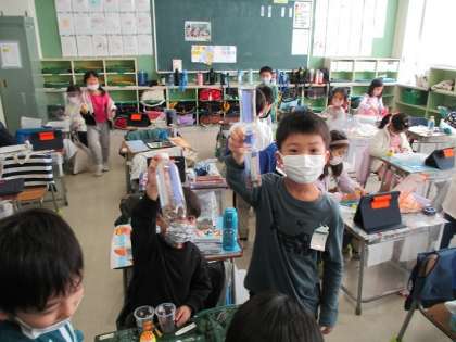 1年生の図工ではどんぐりを使ってコマやマラカスなどを作りました。中にはタケコプターを作るなど、夢中になって作りました。素敵な作品です!