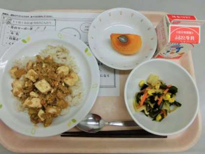 今日は、冬のマーボー丼、牛乳、白菜とわかめの中華サラダ、柿です。
