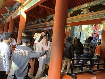家康のお墓を見学したり、鳴き竜の音を楽しんだりして過ごした東照宮。午後2時40分ごろホテルに向かい、バスが出発しました。日光はお天気よく青空が広がっています。気温は11度ですが太陽のぬくもりを感じます。