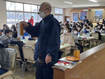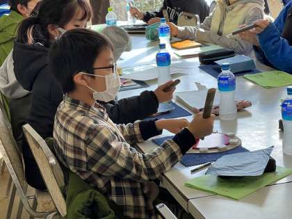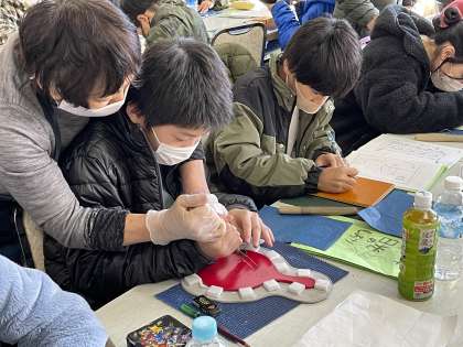 お弁当をいただいた後は、日光彫体験です。講師の先生から、日光彫の伝統や特別の彫刻刀(ひっかき刀)の使い方などを教えていただきました。ひっかき刀は、線彫り用の刃物ですが、普通の三角刀と違って先端を約60度に折り曲げた「切り出し刀」を手前に引いて彫るところから「引掻き(ひっかき)」と呼ばれるようになったそうです。教えていただいた通りにひっかき刀を持つ子どもたち。子どもたちを見守るかのように、日光彫の先生たちが傍で優しく教えてくださいました。すてきな作品ができそうです。