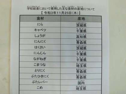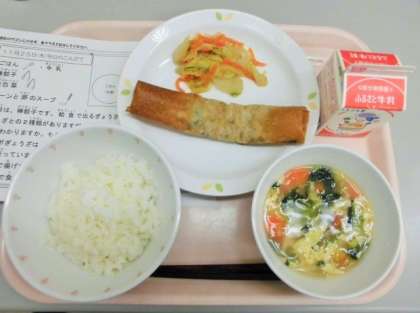 今日は、ごはん、牛乳、棒餃子、辣白菜、コーンと卵のスープです。