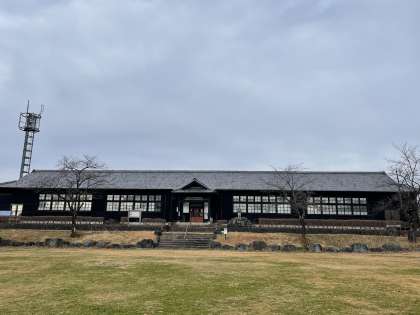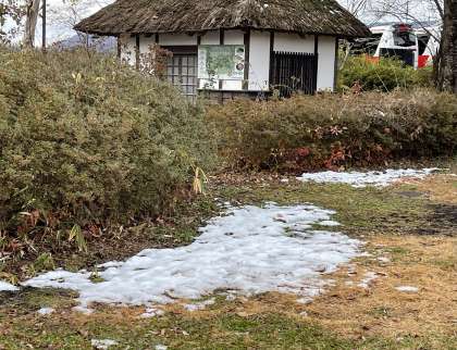 予定通りの時刻で川場村歴史民族資料館に到着しました。尋常小学校跡を民族資料館として使っています。広場の片隅に雪が残っていました。気温は6度です。