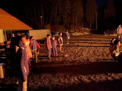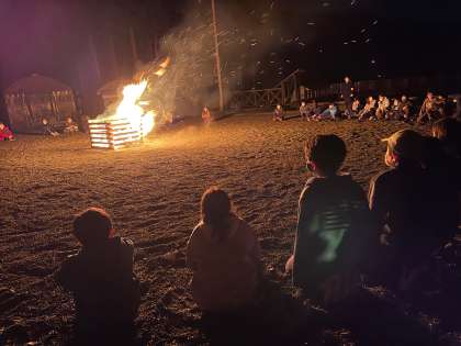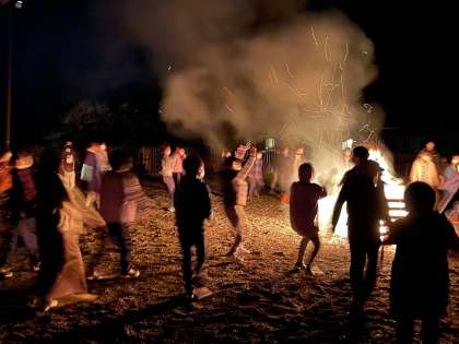 夕食後は待ちに待ったキャンプファイヤーです。子どもたちの司会で進められました。緑の火、友情の火、喜びの火が点火され、キャンプファイヤーがスタートしました。夜になり一段と冷え込んできましたが、火のぬくもりを感じます。ゲームやダンス、歌。みんなで楽しみました。