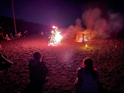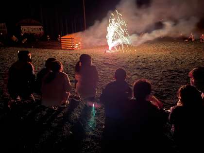 キャンプファイヤーの最後に校歌を歌いました。サプライズで学校の先生たちから花火のプレゼントがありました。このキャンプファイヤーで今日の活動が終わろうとしています。
