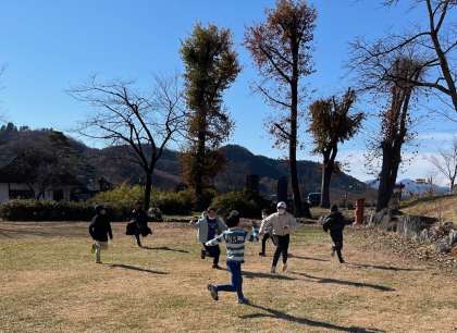 目的地の田園プラザに早く到着できそうだったので、1日目にお昼を食べた川場村歴史民族資料館の広場で思いきり遊びました。気温は11度、太陽の日差しが暖かさを運んできます。みんなで仲よく元気いっぱい遊びました。