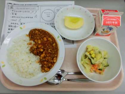 今日は、チリコンカーンライス、牛乳、ポテト入りフレンチサラダ、りんごです。