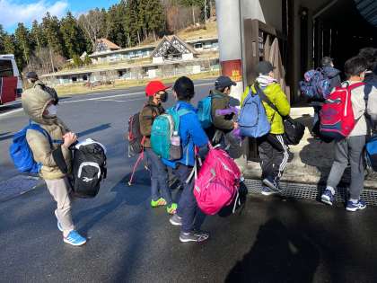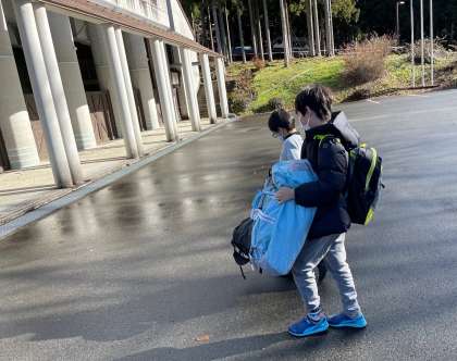 バスから降りると、一人一つの荷物を運びました。朝の雨の影響を考えてお昼は宿舎の屋根つき広場で食べる行程に変更しました。