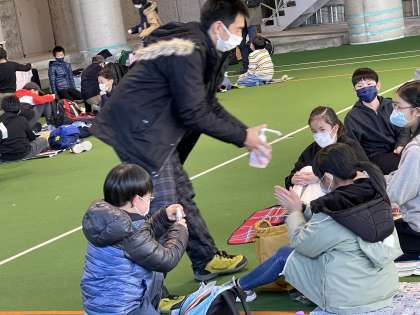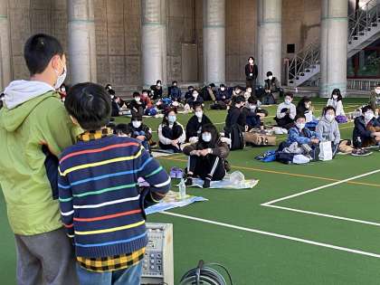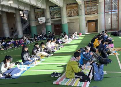 川場村歴史民族資料館前の広場から変更して、宿舎の屋根つき広場で昼食です。コロナ禍のルールをしっかり守ってお弁当をおいしくいただきました。