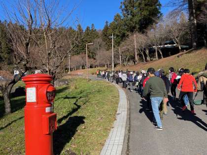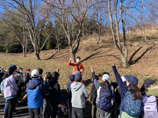13時からは里山体験です。宿舎の周りの里山の様子を丁寧に説明していただきました。1組と4組の前半グループが里山体験したときは道や広場に雪が残っていましたが、今日はすっかり雪はとけています。クリの木とクリの実についてお話を聞きながら観察しました。