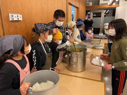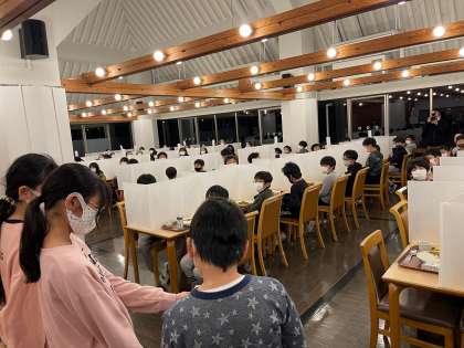 夕食はカレーです。コロナ禍の食事ですから、パーテーションを立て黙食です。それでも、みんなおいしそうに食べていました。