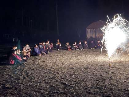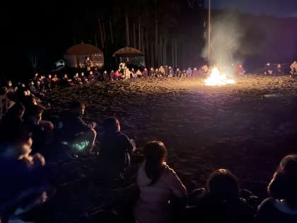 サプライズで学校の先生たちから花火のプレゼントがありました。感謝の拍手をおくりました。このキャンプファイヤーで今日の活動が終わろうとしています。