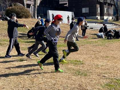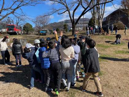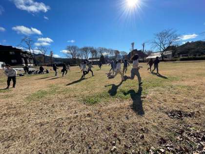目的地の田園プラザに早く到着できそうだったので、1日目に行けなかった川場村歴史民族資料館の広場で思いきり遊びました。気温は7度と低いですが、太陽の日差しが暖かさを運んできます。みんなで仲よく元気いっぱい遊びました。