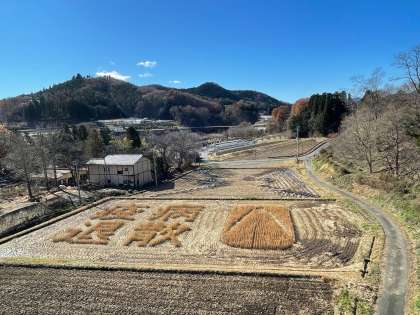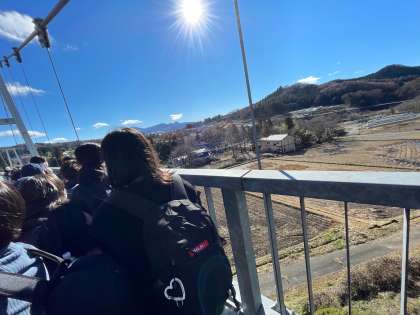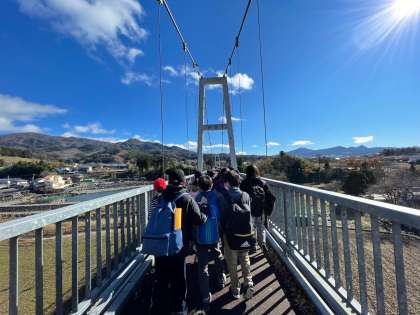 ふれあいはしを渡って、田園プラザに向かいました。つり橋の上から田んぼアートを見ることができました。「疫病退散」今年らしいアートです。青空の下、見える景色もすばらしく、子どもたちも感動していました。