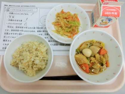 今日は、しょうがとじゃこのごはん、牛乳、大根のそぼろ煮、ぱりぱりサラダです。