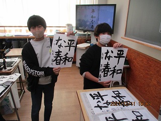 6年生のあるクラスでは習字に取り組んでいました。今日は「平和な春」を書き、書き方のめあてを持ち、姿勢よく真剣に書いていました。漢字とひらがなのバランスが取れていました。
