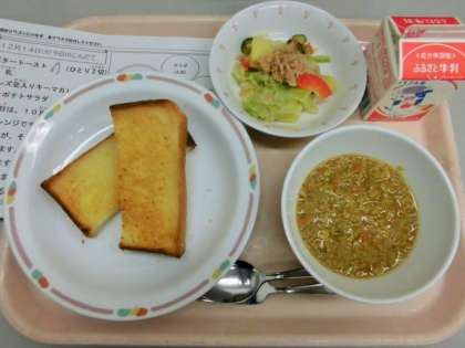 今日は、バタートースト、牛乳、レンズ豆入りキーマカレー、ツナポテトサラダです。