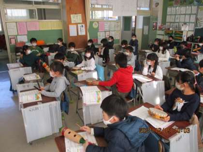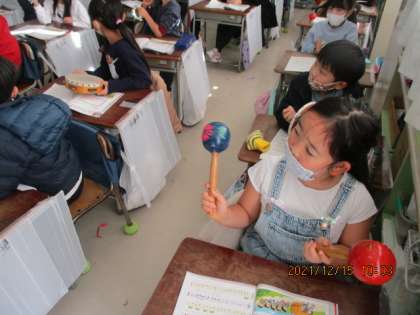 2年生の音楽ではマラカスやずず、タンバリン、ギロなどの多くの楽器を使って「かぼちゃ」という曲に挑戦しました。子どもたちは「いろいろな楽器の音を重ねて演奏する」楽しさを実感することができました。