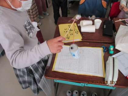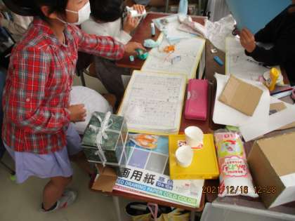 2年生の生活科では身の回りの物を使っておもちゃ作りをしました。楽器を作ったり、けん玉、コマ、くじ箱、、、。しかし、生活科です。立派な学習ですので「学習のめあて」があります。おもちゃ作りの工夫も考えます。子どもたちは、楽しく活動できました。楽しく遊んでくださいね!