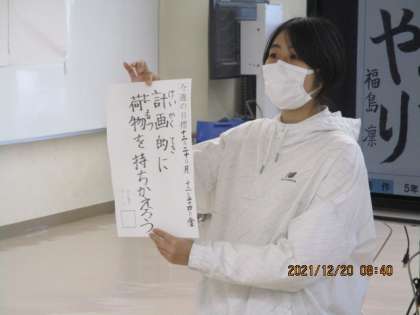 2学期も残すところ1週間となりました。学習と生活のまとめを確実に行い、冬休みを迎えてほしいと思います。音楽バックや習字セットなど、持ち帰りの荷物も計画的に持って帰るよう指導してまいります。今週の生活目標は「計画的に荷物を持ち帰ろう」です。学期末で疲れがたまり風邪をひくなど体調がすぐれない児童もいます。ご家庭においても体調管理をお願いいたします。